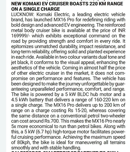 The Komaki MX16 redefines riding with its bold design and advanced EV engineering. Built for performance, comfort, and range, this electric cruiser bike makes every journey unforgettable.